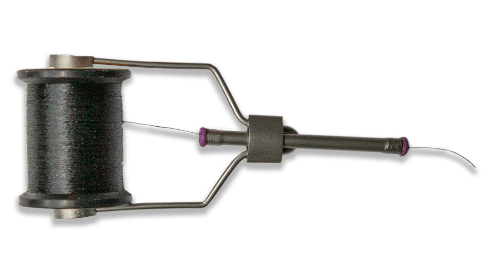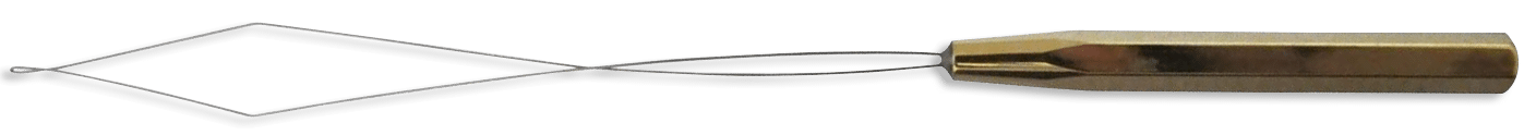 Om de binddraad door het buisje te krijgen kun je de draad aan de onderkant invoeren en aan de bovenkant hard zuigen, maar een draadtrekker is ook handig. Het is een wat grotere uitvoering van het ‘draad door het oog van de naald’ tooltje.
