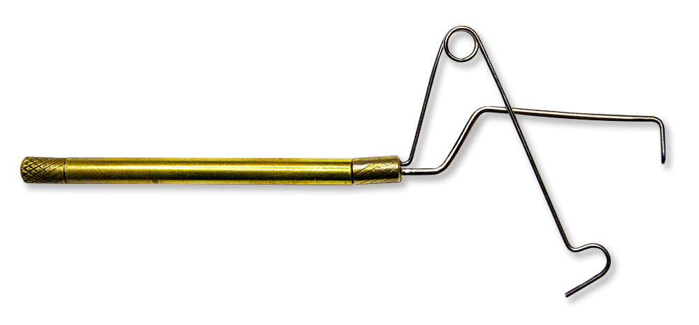 Dit is een handig stukje gereedschap gemaakt van twee buisjes die in elkaar passen en waarvan de grootste dicht zit. Het wordt gebruikt om het holle hertenhaar voor bijvoorbeeld de vleugels van een vlieg met de punten gelijk te krijgen voor het inbinden om bijvoorbeeld de vleugels te imiteren. Je zet de twee buisjes in elkaar, stopt het bosje haar met de punten naar beneden erin en klopt er mee op de tafel. Houd de buisjes horizontaal en trek voorzichtig het binnenste buisje eruit. Je kunt nu het bosje met de gerichte punten eruit nemen en inbinden.